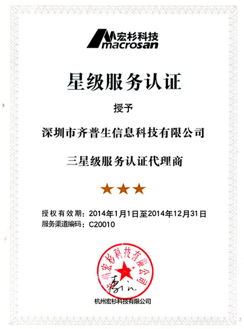 2013年12月,齊普生公司再傳喜訊:榮獲杭州宏杉科技有限公司(以下簡稱:宏杉科技)三星級服務(wù)認證代理商資格證書!